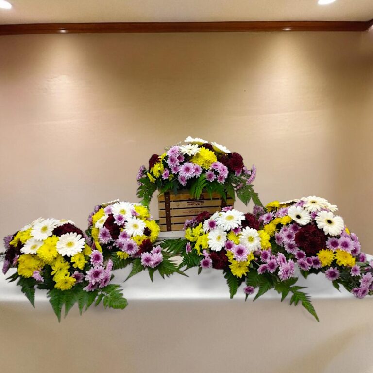 This is an elegant and beautifully arranged floral table centerpiece, perfect for functions and events. It features a harmonious combination of fresh flowers. The arrangement is designed in a horizontal, cascading style, making it ideal for dining tables, reception counters, or event displays. It is suitable for weddings, corporate etc.