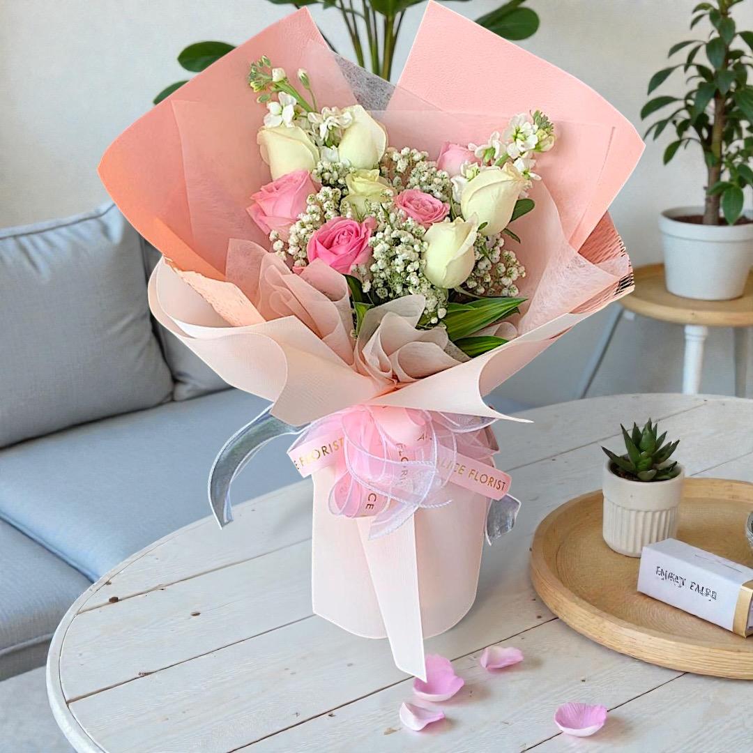 This charming bouquet features a graceful mix of white and pink roses, white matthiola with delicate baby’s breath, beautifully wrapped in layers of soft peach-pink wrapping paper. This bouquet exudes sweetness and sophistication — perfect for brightening someone’s day.