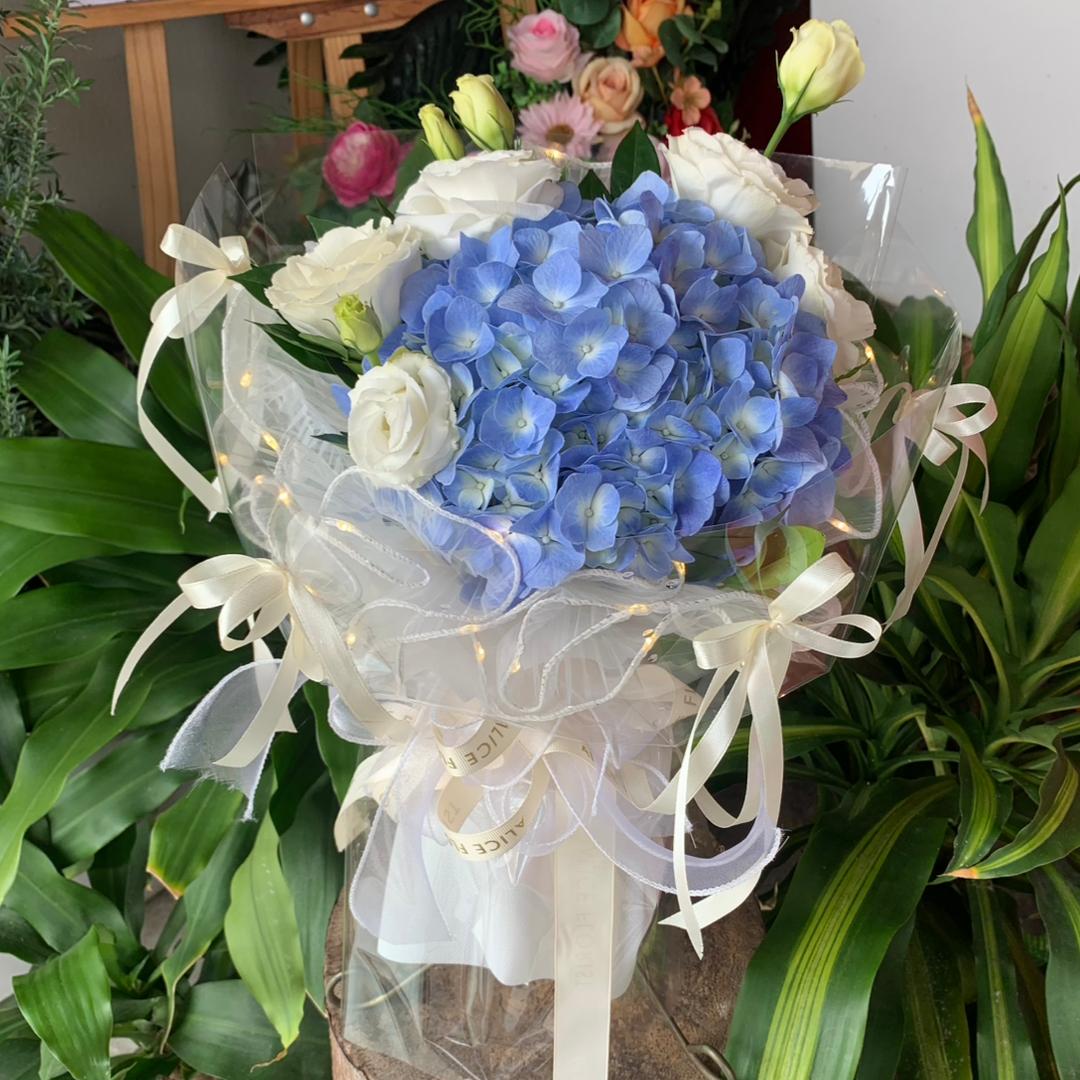 This elegant hand bouquet features a stunning blue hydrangea as the centerpiece, symbolising gratitude, sincerity, and heartfelt emotions. It is beautifully complemented with pure white eustoma, Wrapped in soft transparent layers and finished with delicate ivory ribbons and warm fairy lights, this bouquet gives off a romantic and graceful charm.