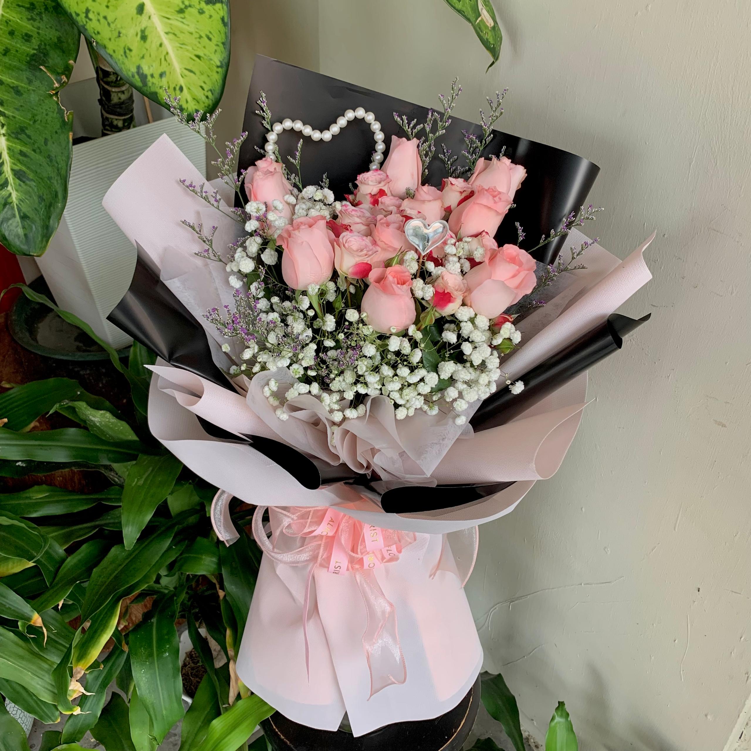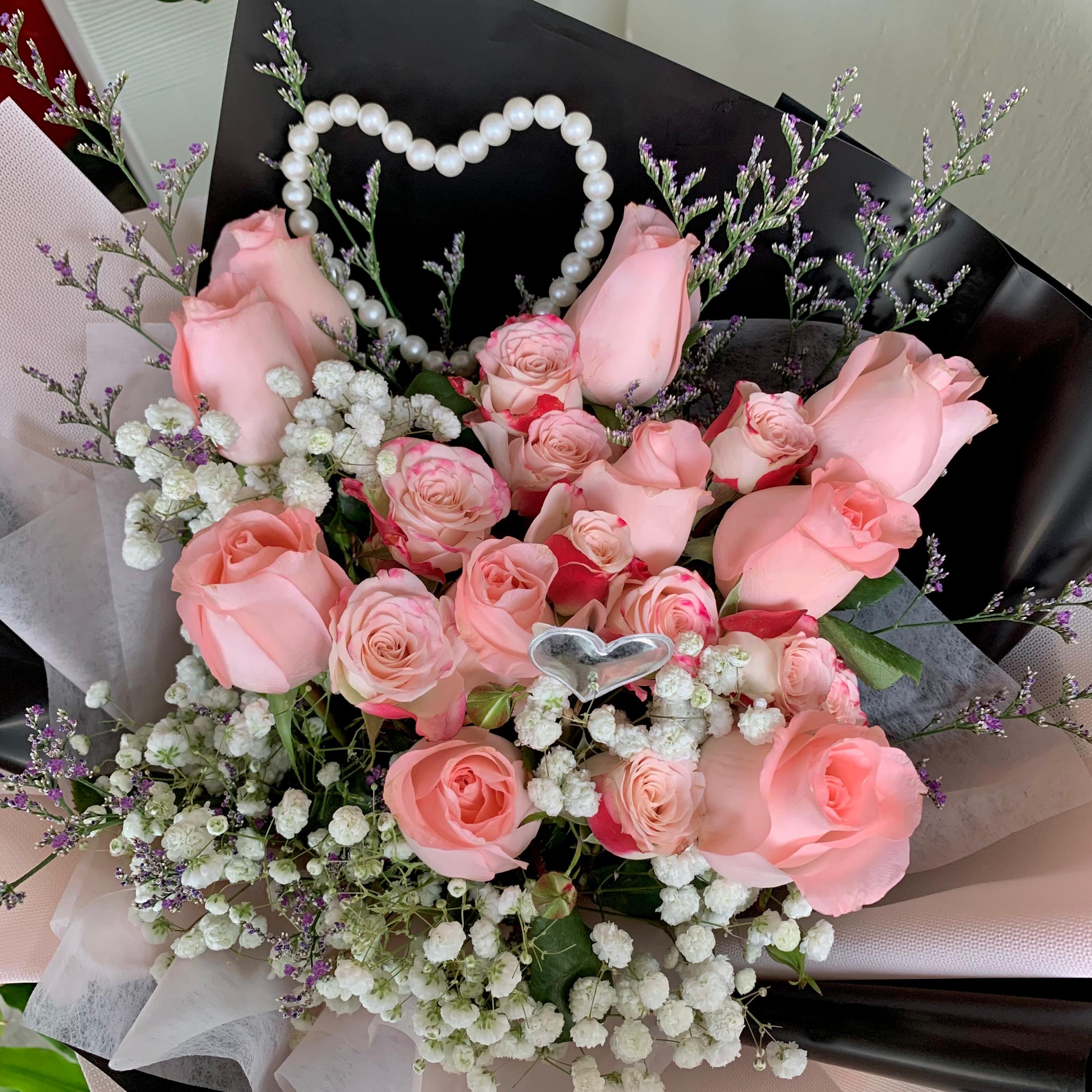 Adorned with a pearl heart ornament. This bouquet delivers a modern yet classic Valentine look — simple, graceful, and full of love.