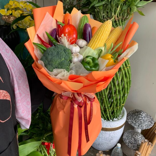 This unique and vibrant bouquet is a refreshing twist on the traditional flower gift for Mother’s Day. Instead of flowers, it features a gorgeous array of fresh vegetables — including corns, broccoli, bell peppers, chili peppers, carrots, garlic, eggplants, green beans, bitter gourd, and enoki mushrooms — all beautifully wrapped in lively orange and cream paper.