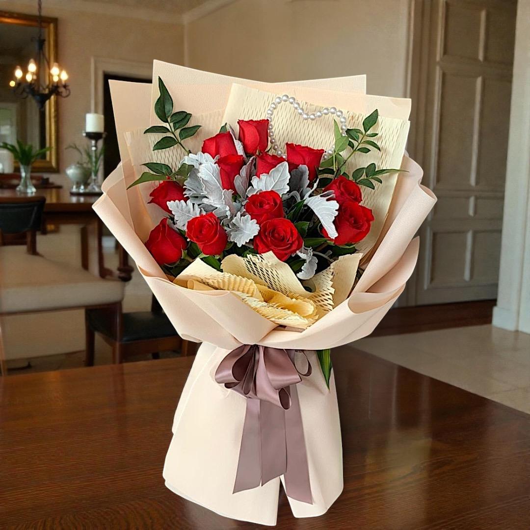 This bouquet features 12 stalks of red roses paired with silver-leaf foliage for a romantic and elegant contrast. Wrapped in cream-beige paper and finished with a satin ribbon, it gives a luxurious and classy impression. The added pearl heart accent brings a touch of charm and sweetness.