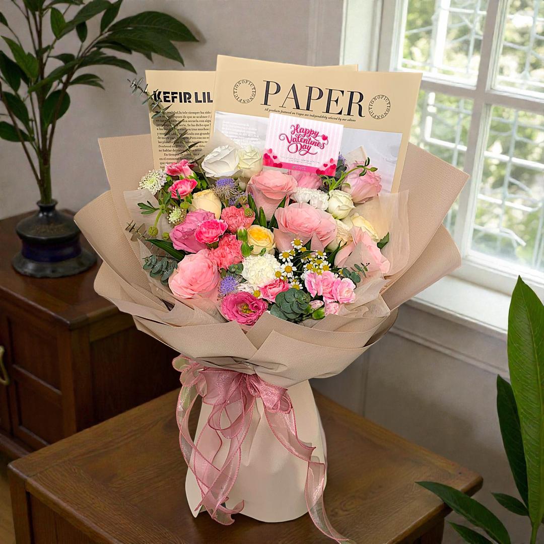 A charming Valentine bouquet filled with 4 pink and 3 champagne roses, 2 pink carnations and 2 white carnations, 2 pink baby carnations, 3 eustomas, chamomiles, and fresh greenery, beautifully wrapped in nude-toned paper. The pastel colour palette creates a gentle, heartfelt expression of love—perfect for someone who appreciates elegance with a touch of sweetness.