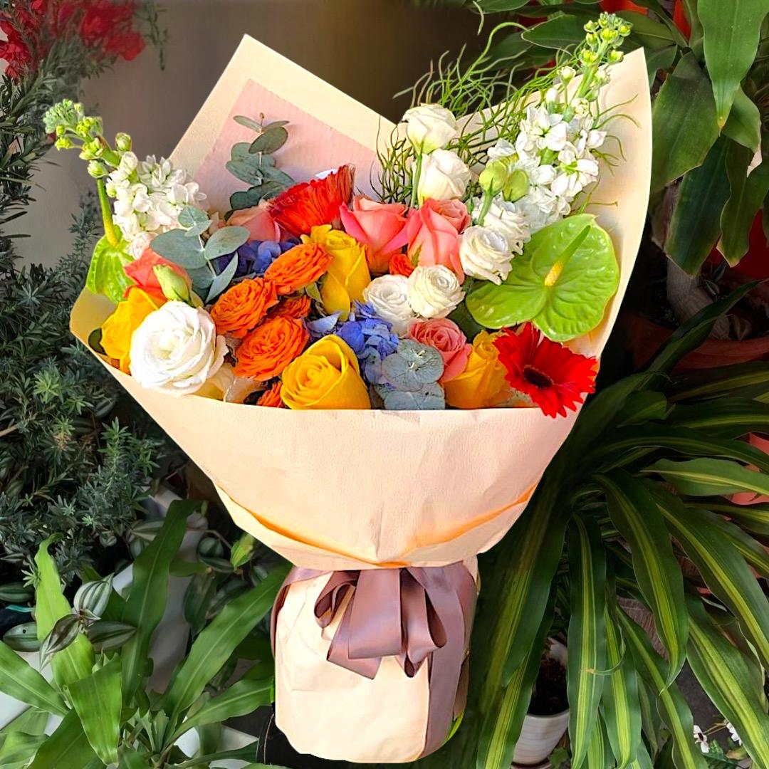 Express your love this Valentine’s Day with this beautifully wrapped romantic bouquet, featuring a joyful blend of 2 stalks of orange baby roses, 3 stalks of orange roses, 4 stalks of two-tone pink roses, 2 stalks of red daisies, blue hydrangeas, 2 green anthuriums, 4 stalks matthiola, 3 white eustoma and seasonal blooms. This arrangements represent passion, happiness, and sincere affection. Wrapped in soft premium paper and finished with a neat ribbon, this bouquet is perfect for making hearts flutter.