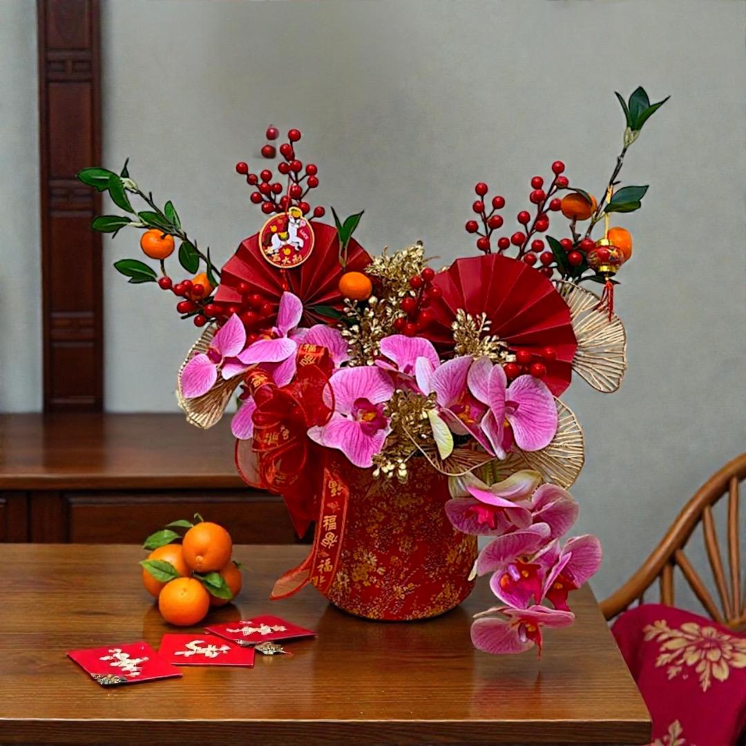 This arrangement is perfect for those who want a sophisticated yet joyful CNY décor or gift. It adds warmth, colour, and prosperity to any space.