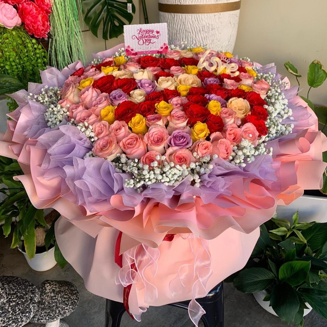 A breathtaking ocean of 99 roses in every romantic hue — fiery red, gentle pink, sunny yellow, champagne and dreamy purple roses arranged in a heart-shaped symphony with baby breath surrounded. This grand gesture whispers one simple truth — My love for you knows no bounds. 99 roses and “love” LED light.