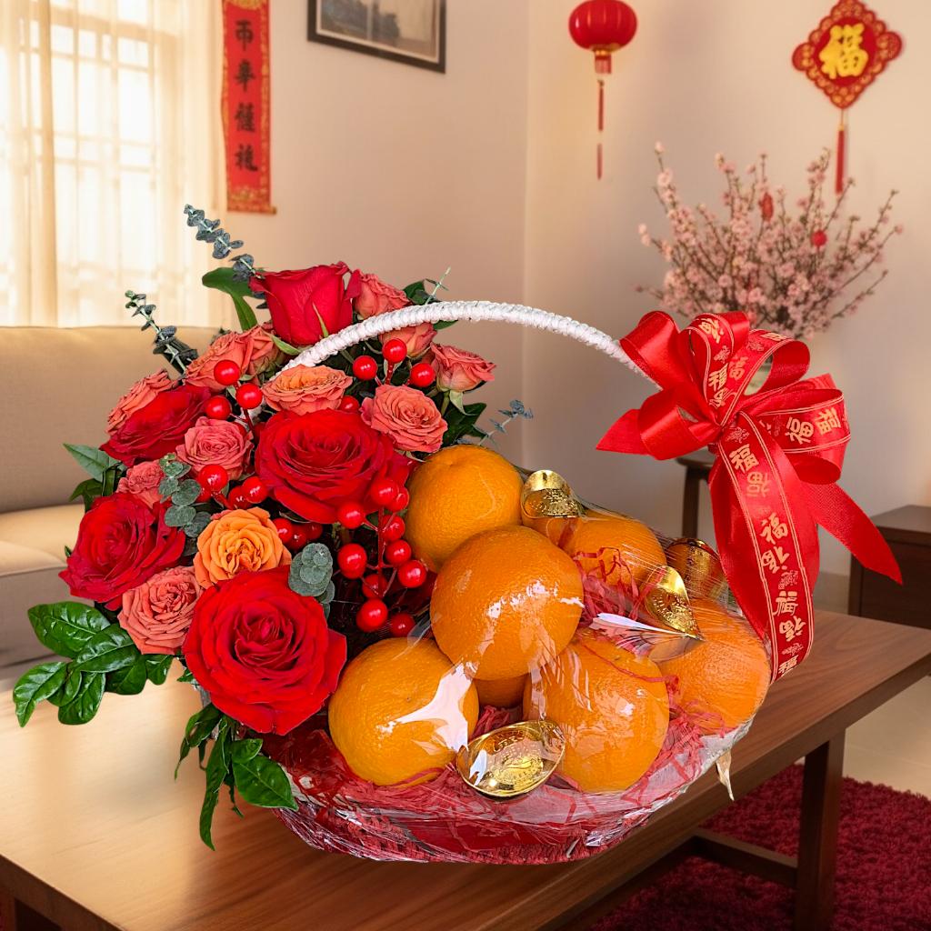 A beautiful combination of fresh mandarins and premium red roses, elegantly arranged in a festive basket. Mandarins symbolise luck and prosperity, while red and orange roses represent joy, harmony, and good fortune.