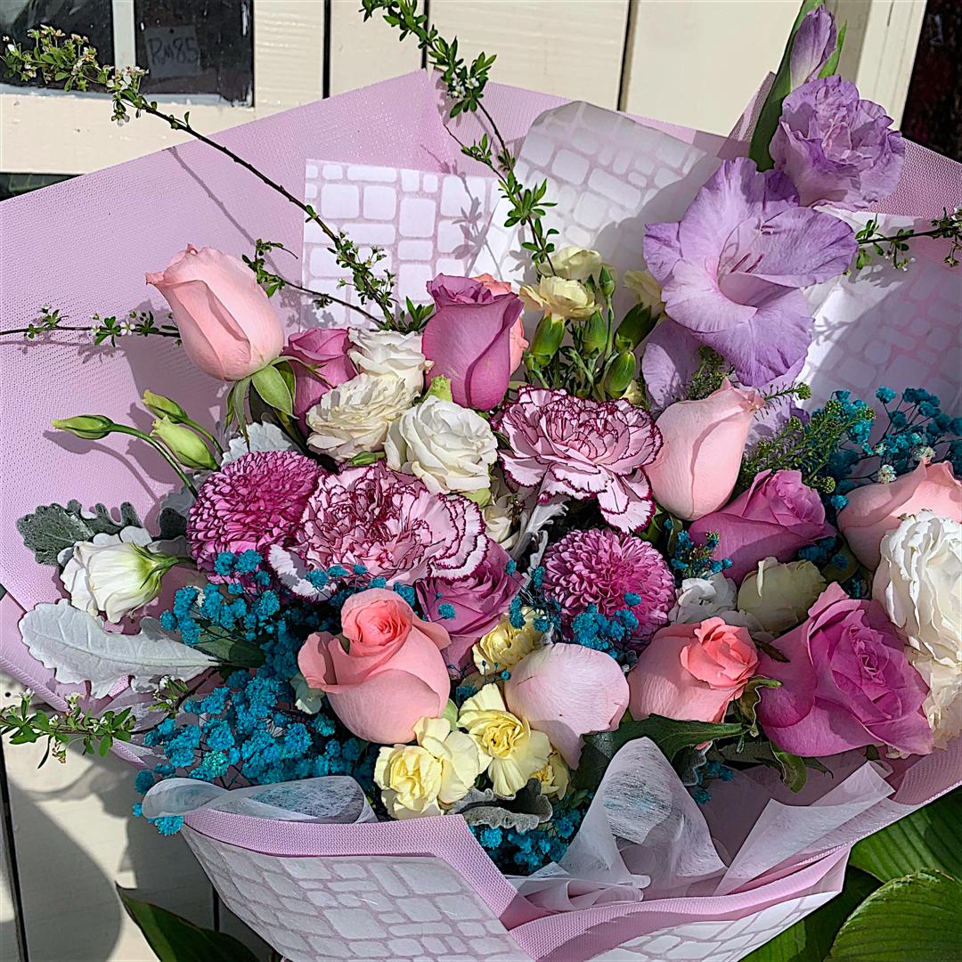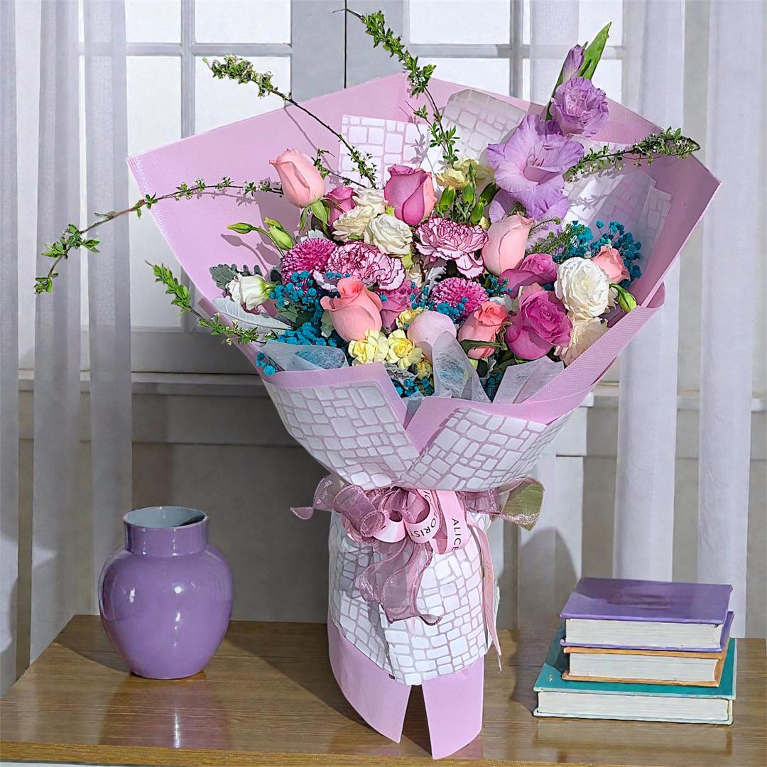 This charming pastel bouquet features a delicate mix 11 stalks of pink and purple roses, and 2 baby yellow carnations, 3 white eustomas, 2 purple chrysanthemums, and purple gladiolus as seasonal blooms, beautifully wrapped in soft purple toned paper. The gentle colour palette creates a sweet, elegant look that’s perfect for expressing tender love and admiration.