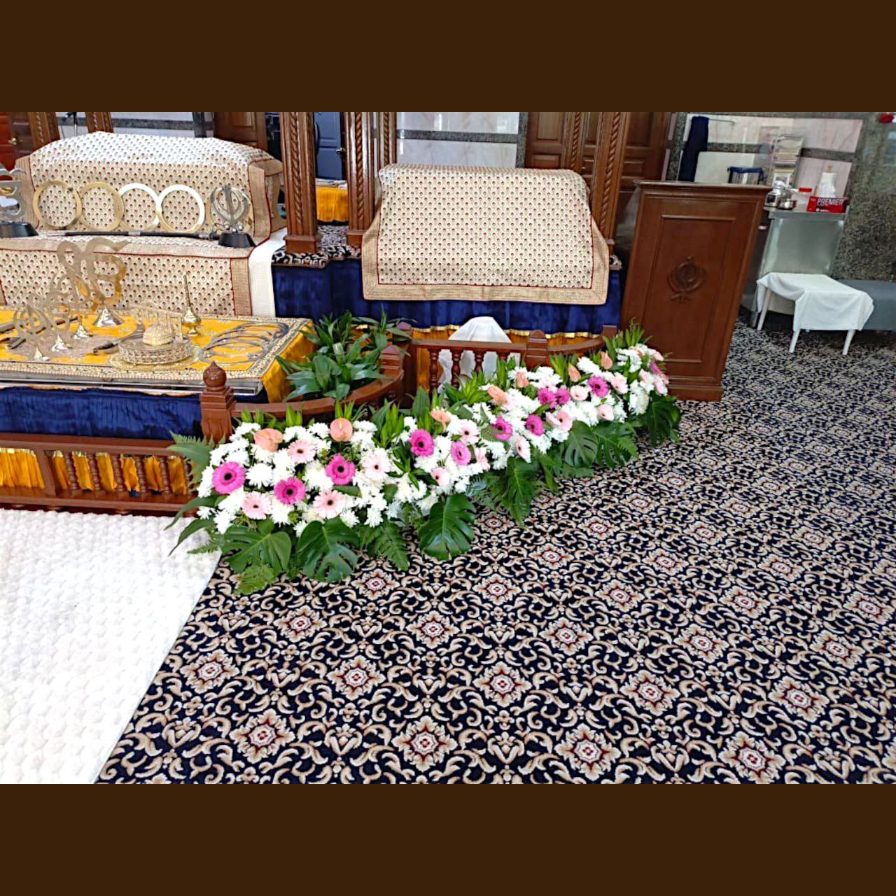 The floral arrangements are beautifully combine with vibrant blooms of gerbera daisies, and white chrysanthemums accented by lush green leaves. The delicate blooms add a sense of purity and joy, symbolizing love and new beginnings, while also adding a touch of festivity to the wedding ceremony. This setup not only respects the sanctity of the temple but also provides a warm, graceful backdrop for the couple and their families to cherish.