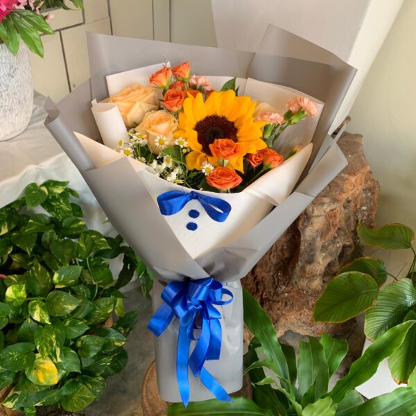 Simple, stylish, and full of warmth. It includes a standout sunflower surrounded by champagne roses, baby orange roses, chamomiles, and light pink carnations, all wrapped in gray with a unique “tuxedo” style bow. The bold blue ribbon and button accents give it a masculine, elegant finish. A perfect choice for the classic, well-dressed man.