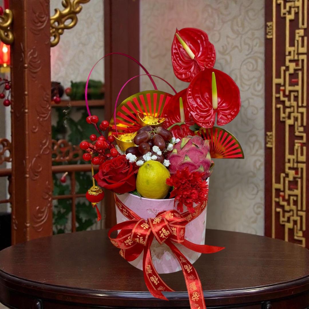 Usher in a year of abundance and good fortune with this beautifully crafted with auspicious fruits and vibrant red rose and carnation. Featuring fresh grapes, dragon fruit, lemon, and festive red anthuriums, this arrangement symbolizes wealth, success, unity, and overflowing blessings.