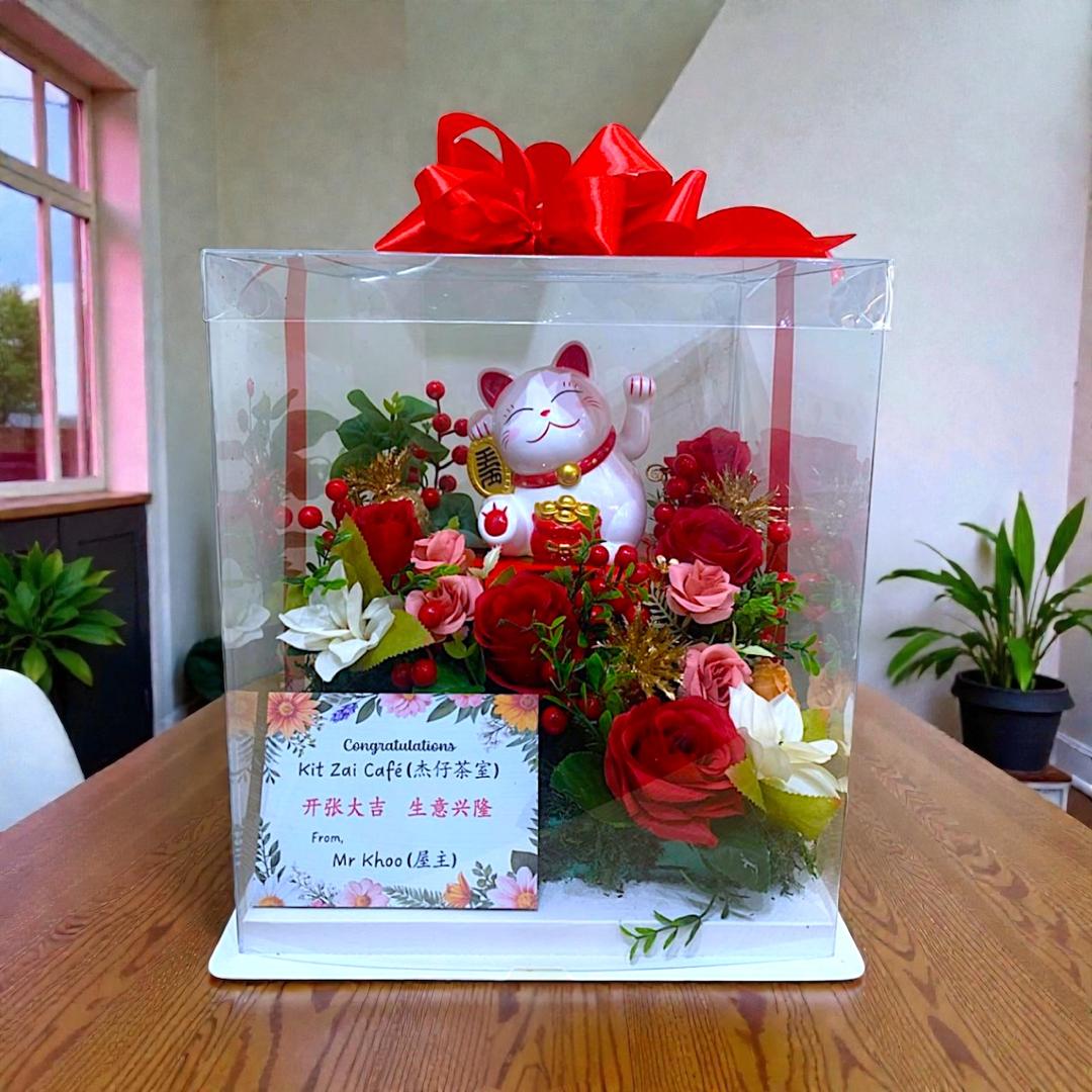 Artificial floral arrangement gift box with fortune cats for new shop opening.