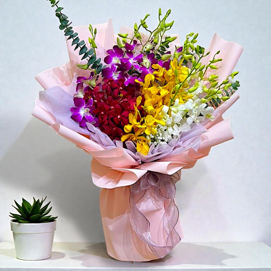 A vibrant and cheerful bouquet bursting with color, showcasing a mix of bright yellow, red, white and purple orchids designed to bring joy and excitement.