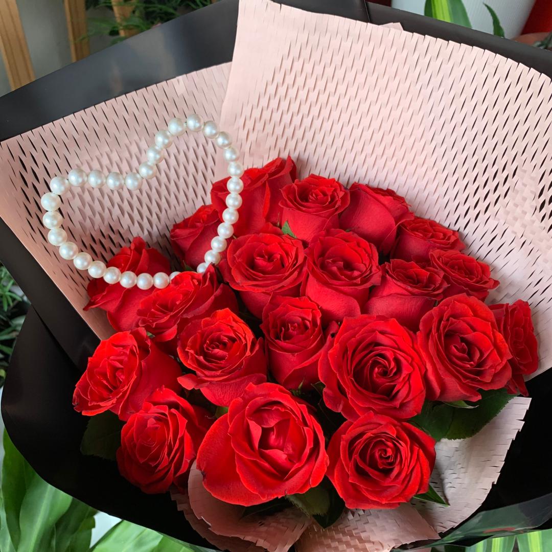 Bold, dramatic, and full of passion — this bouquet showcases lush 20 stalks of red roses. Wrapped in sleek black and blush pink paper, it stands out with a modern, high-end aesthetic. The pearl heart decoration adds a sweet Valentine’s touch, making it look exclusive and luxurious.