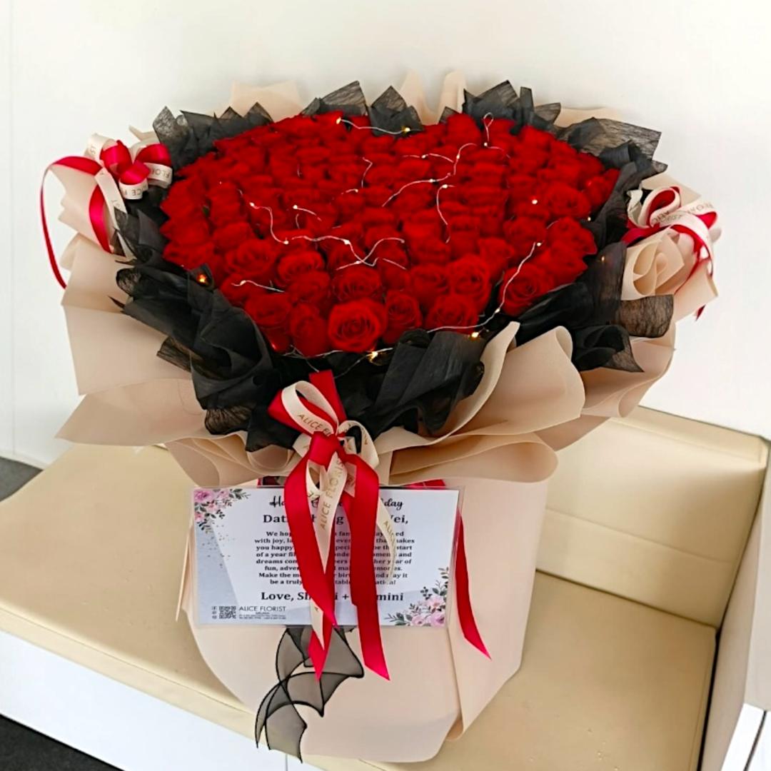 Dazzle your special one this Valentine’s Day with a breathtaking heart-shaped arrangement of 99 lush red roses and glowing fairy lights.