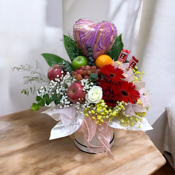 Fresh flowers, chocolates & fruits, topped with balloons! Mixture of fruits includes kiwi, apples, oranges, chinese pear etc.