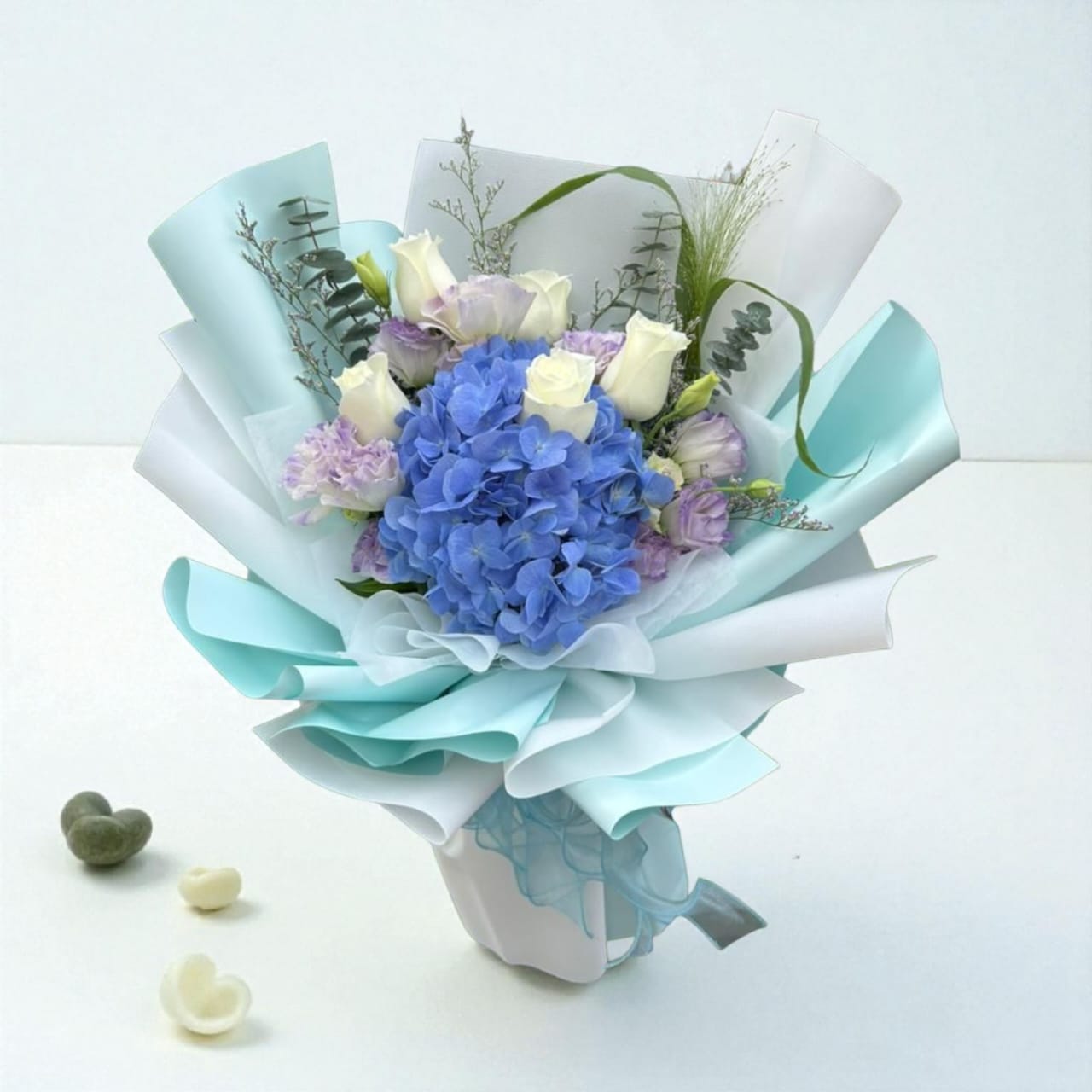 It features vibrant Blue Hydrangea, White Rose, Soft Purple Eustoma and delicate greenery. The wrapping is done in coordinated shades of white and pastel blue, giving it a fresh and elegant look.
