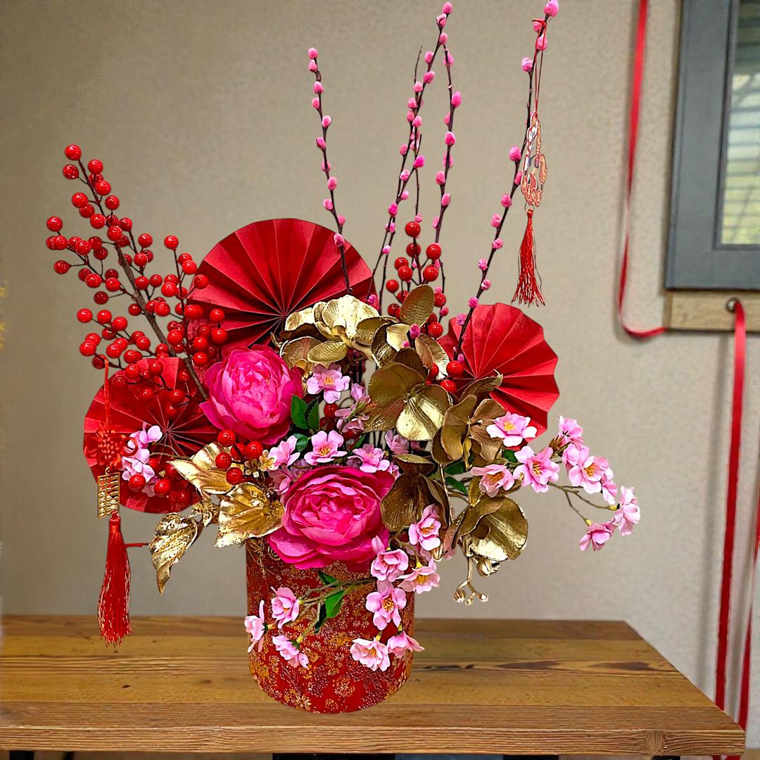 A premium Chinese New Year floral display combining rich red tones, delicate pink blossoms, and luxurious gold accents. Inspired by traditional festive aesthetics, this arrangement symbolises wealth, growth, and continuous blessings.